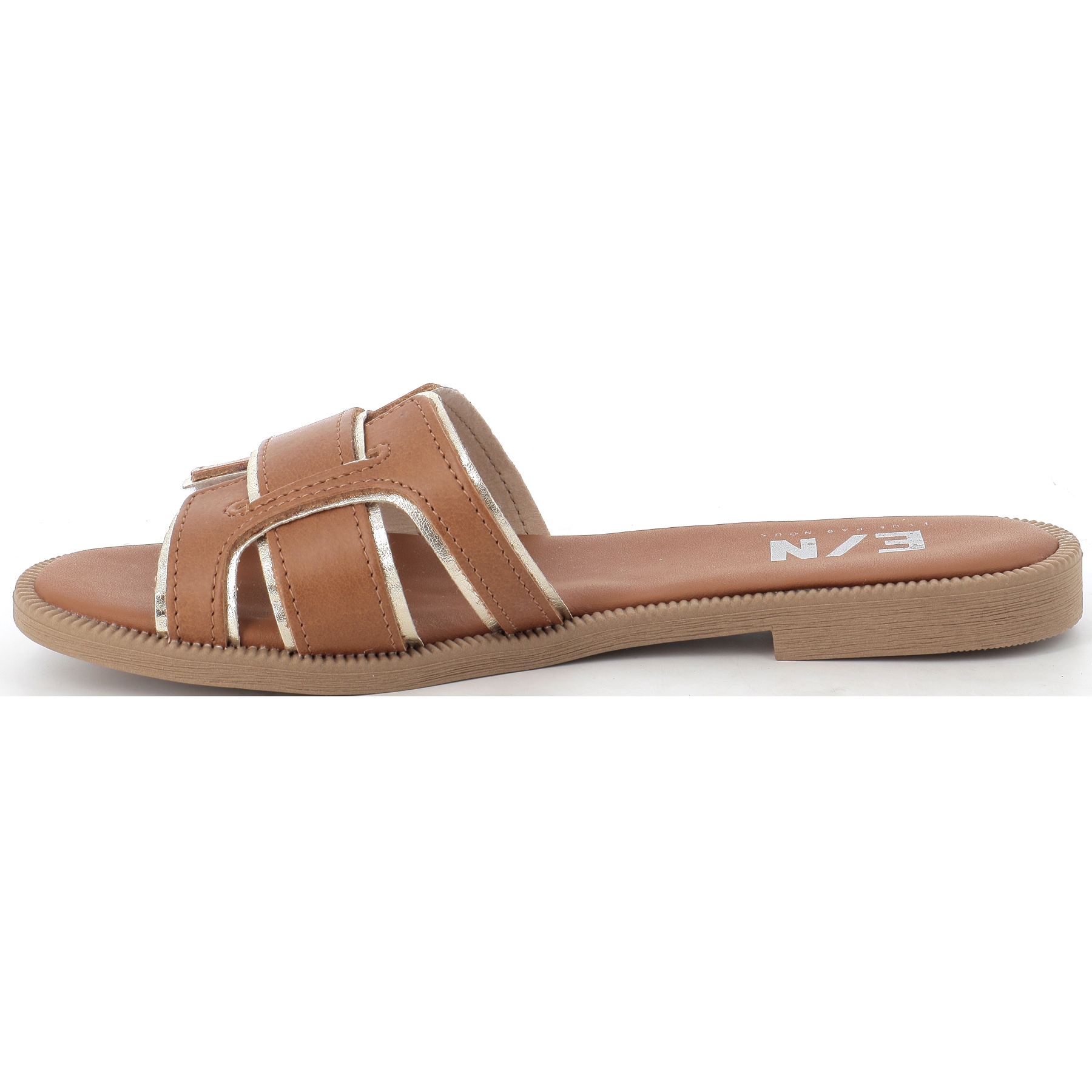Cette mule de couleur camel agrémenté d'or, possède une semelle en cuir souple et moelleuse, idéal pour un confort optimal.