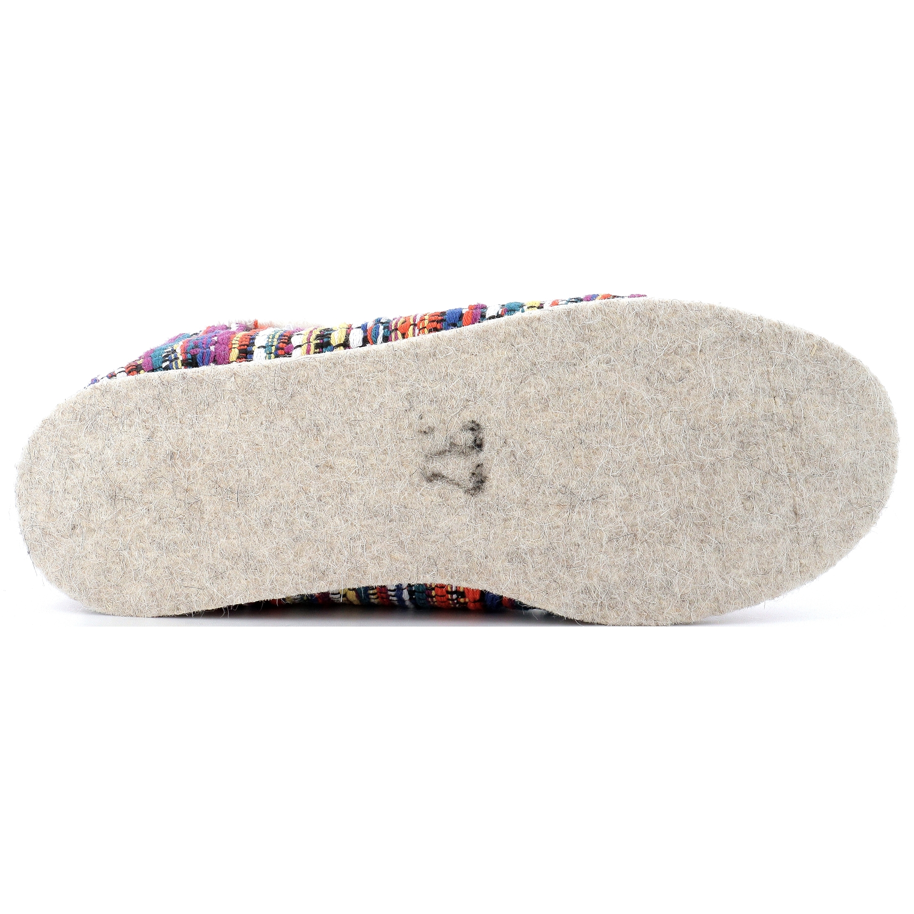 L'incontournable charentaise avec sa semelle feutre tissée 5 chaines, "silencieuses", avec son dessus multicolor et son intérieur en laine.