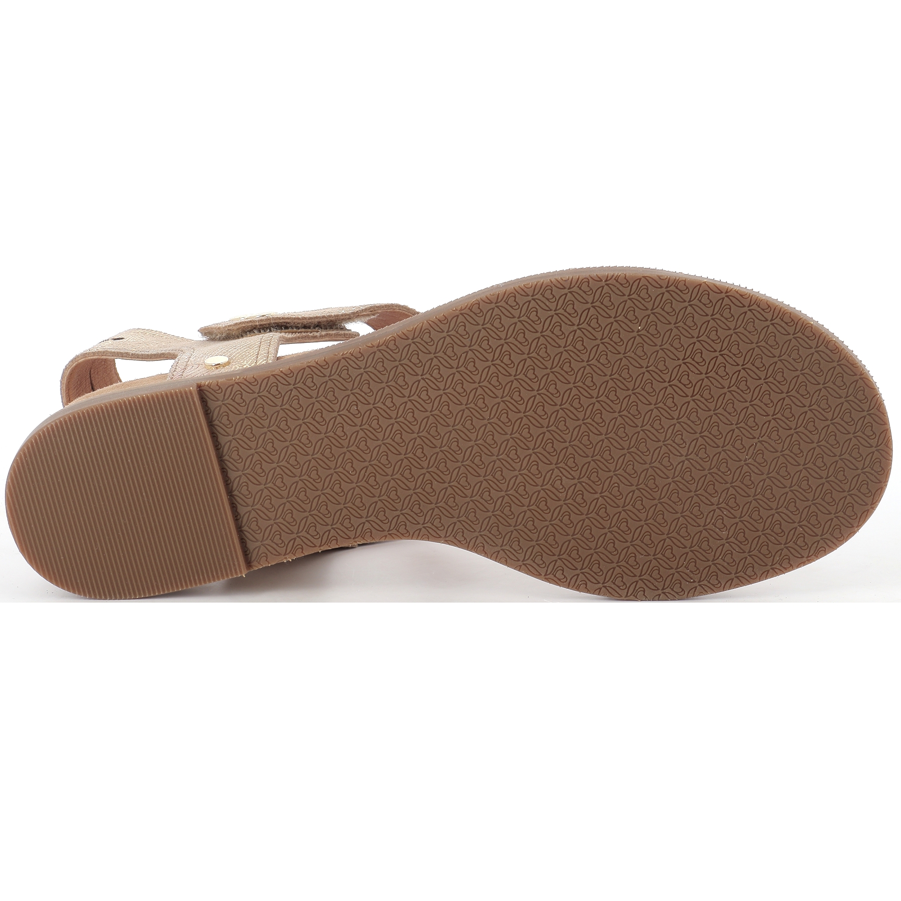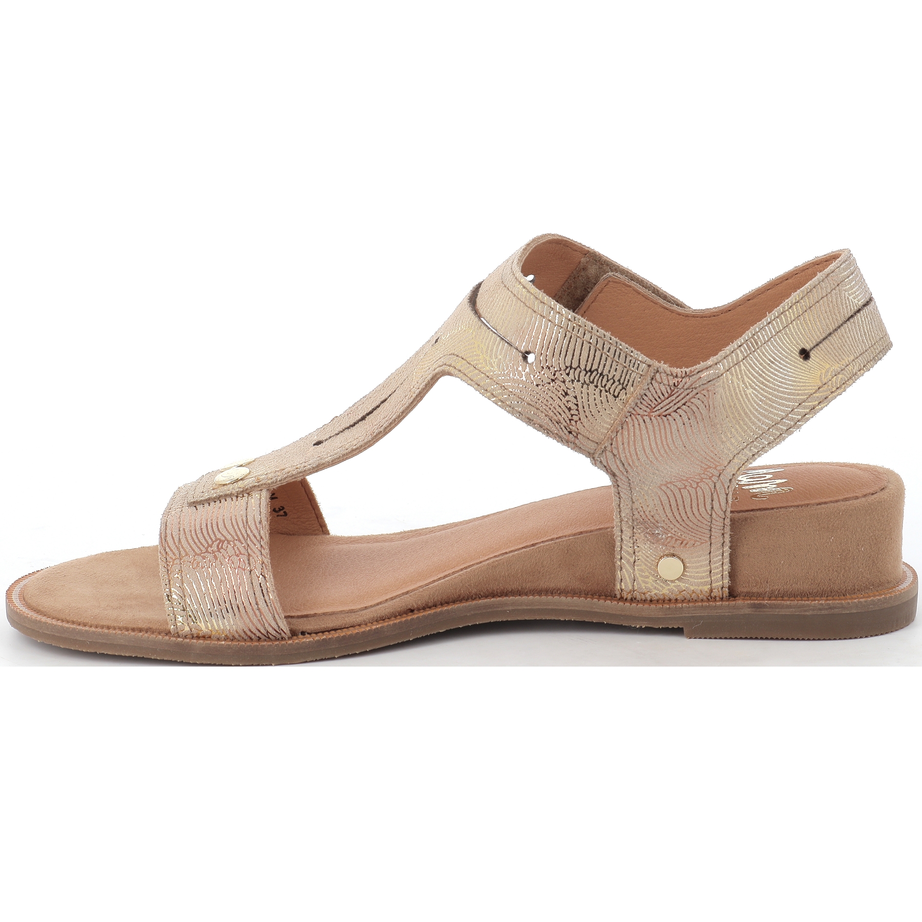 Ce nu-pied monté sur une semelle compensée fantaisie et son cuir imprimé cuivré ne peut que vous plaire !