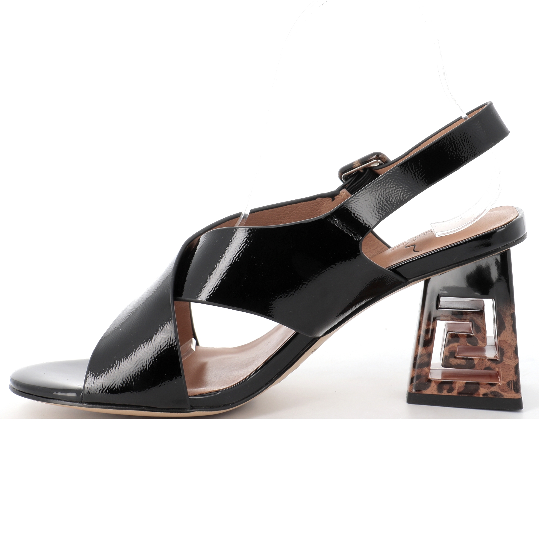 Ce nu-pied en cuir vernis noir avec une touche d'imprimé animal, est monté sur une semelle intérieure cuir matelassée pour un confort optimal.